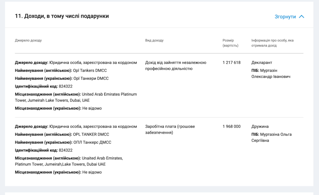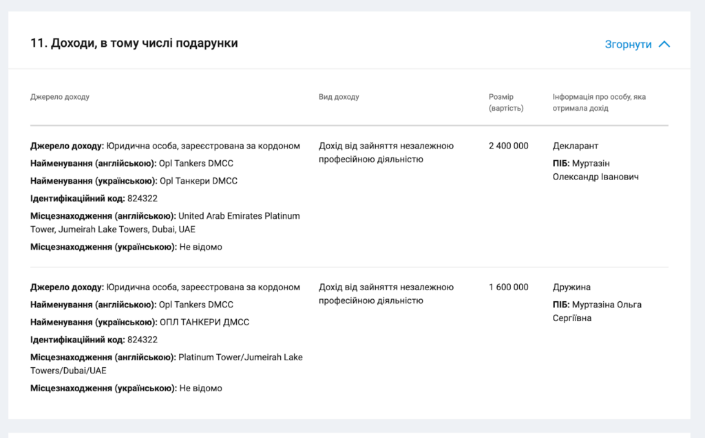На що ж живе депутат з родиною? За даними декларації за 2024 рік, і депутат, і його дружина працювали в фірмі Opl Tankers DMCC в місті Дубай, в ОАЕ. Аналогічна ситуація була і у 2023 році. А от у 2022 році депутат ще працював у власній фірмі і доходи його були дуже скромними. Як, власне, і в 2021 році. А у 2020 році в родині взагалі ніхто ніде не працював. Мабуть, жили на заощадження та доходи з продажу майна. Оскільки до 2020 року депутатом Олександр Муртазін ще не був і декларацій не подавав, звідки в колишнього податківця взялися ті заощадження невідомо.