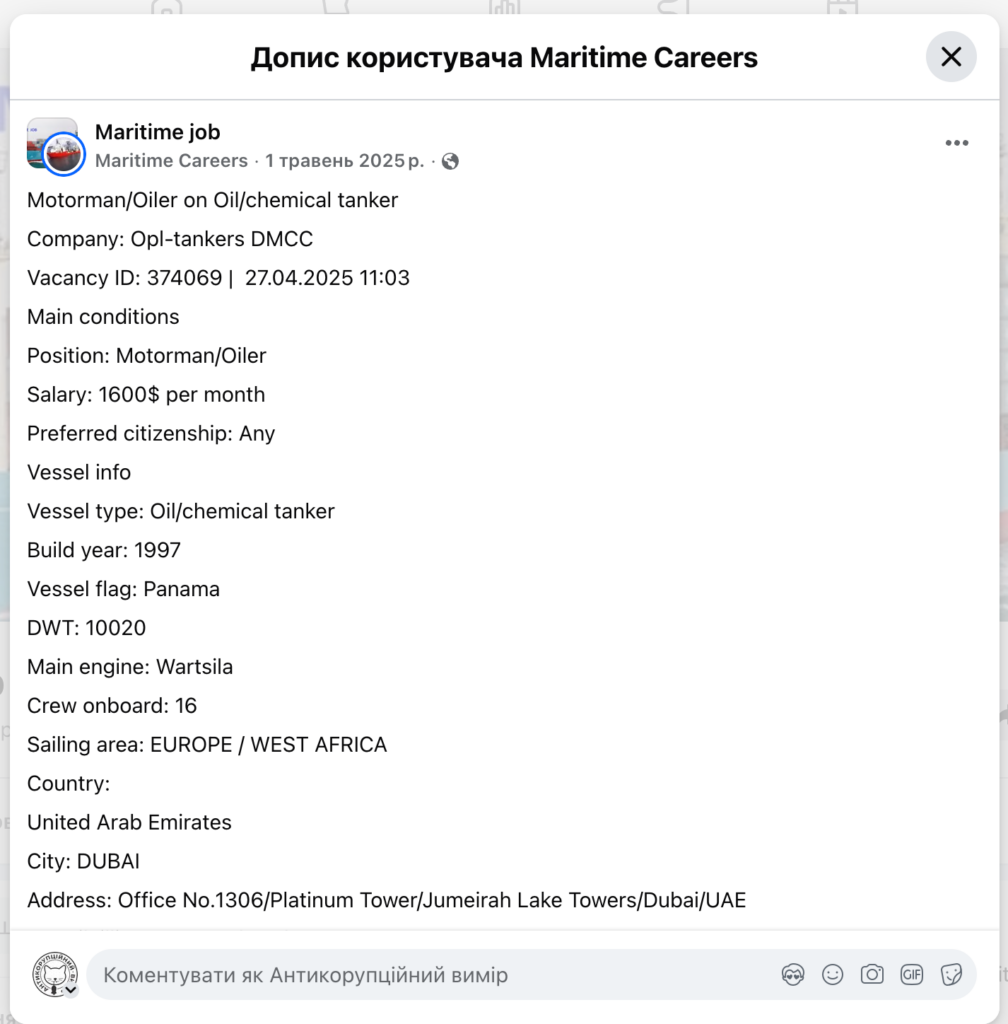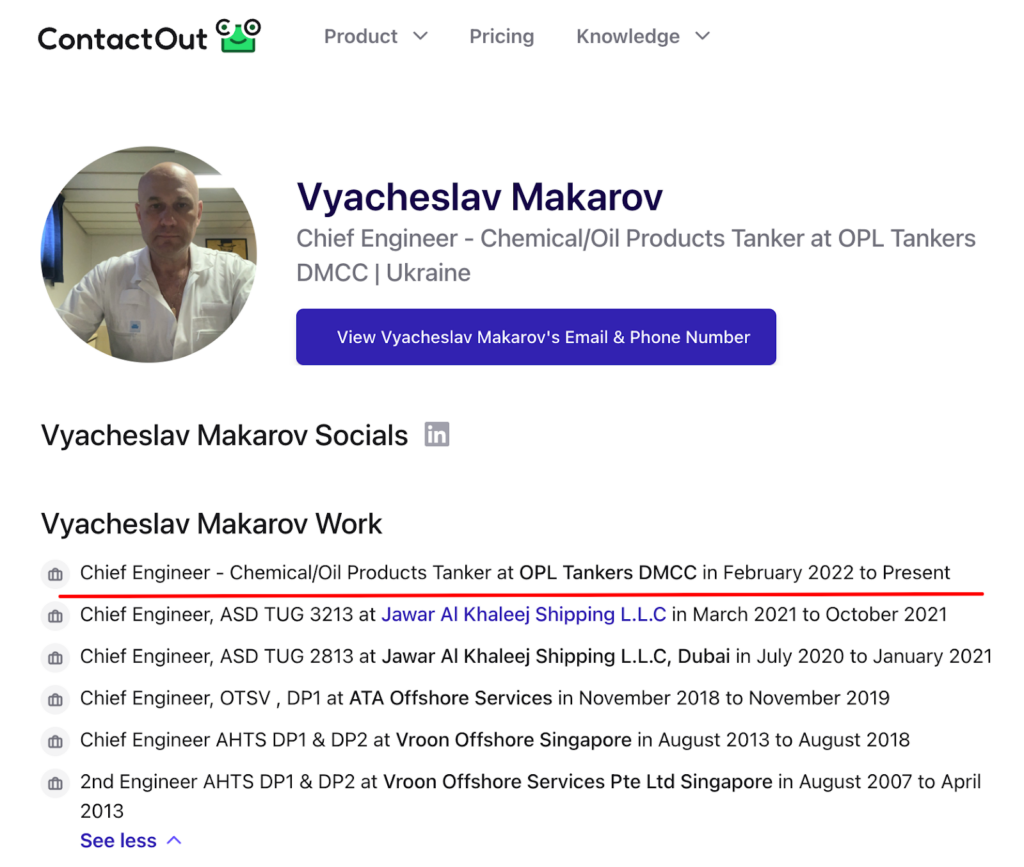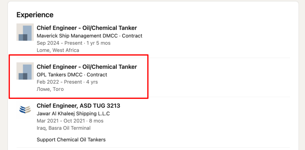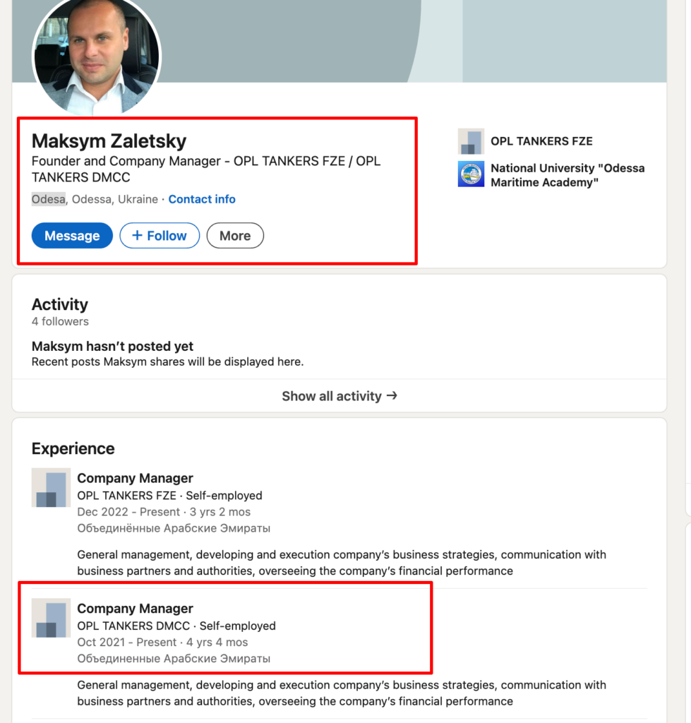 Цей інженер є і в соцмережі linkedin. І, що цікаво, місцем розташування компанії OPL Tankers DMCC він вказує не ОАЕ, а Того.