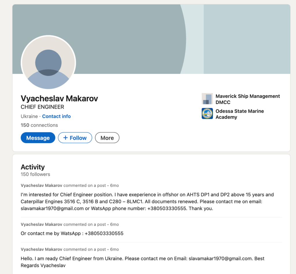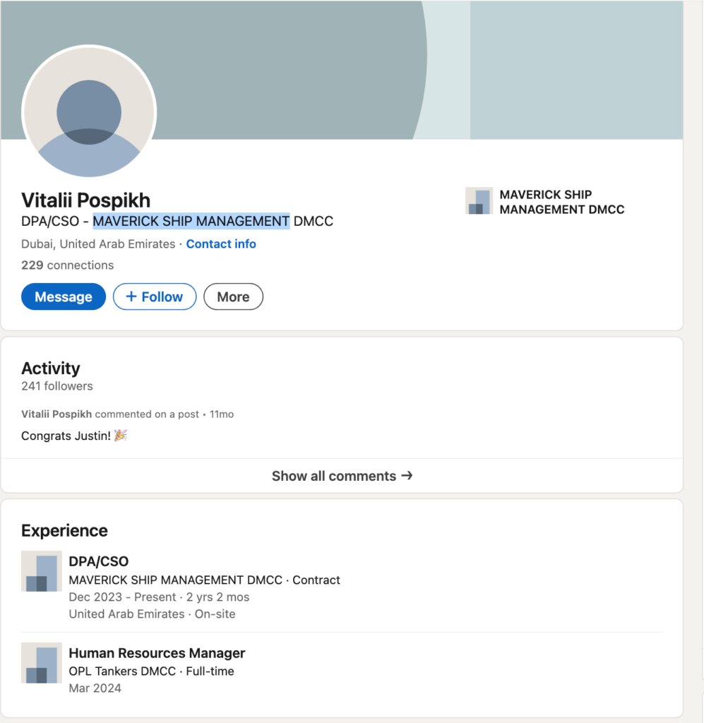 А на linkedin цей пан вказав, що працює в MAVERICK SHIP MANAGEMENT.