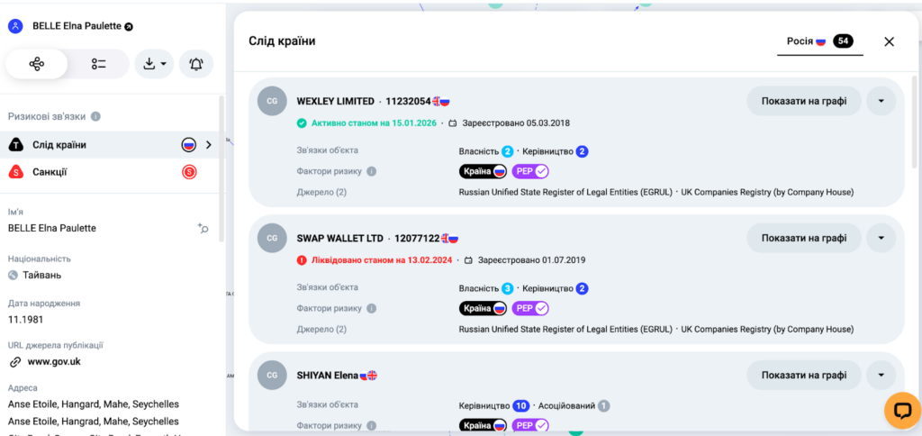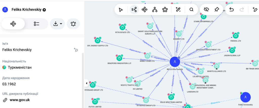 Пані Белле Елна Паулетт керує або керувала раніше величезною кількістю фірм, зареєстрованих у Великій Британії. І принаймні 54 з них мали серед власників росіян, в тому числі політично значущих осіб. Також сервіс ідентифікує 21 звʼязок з Білоруссю. Трапляються і громадяни Туркменістану.