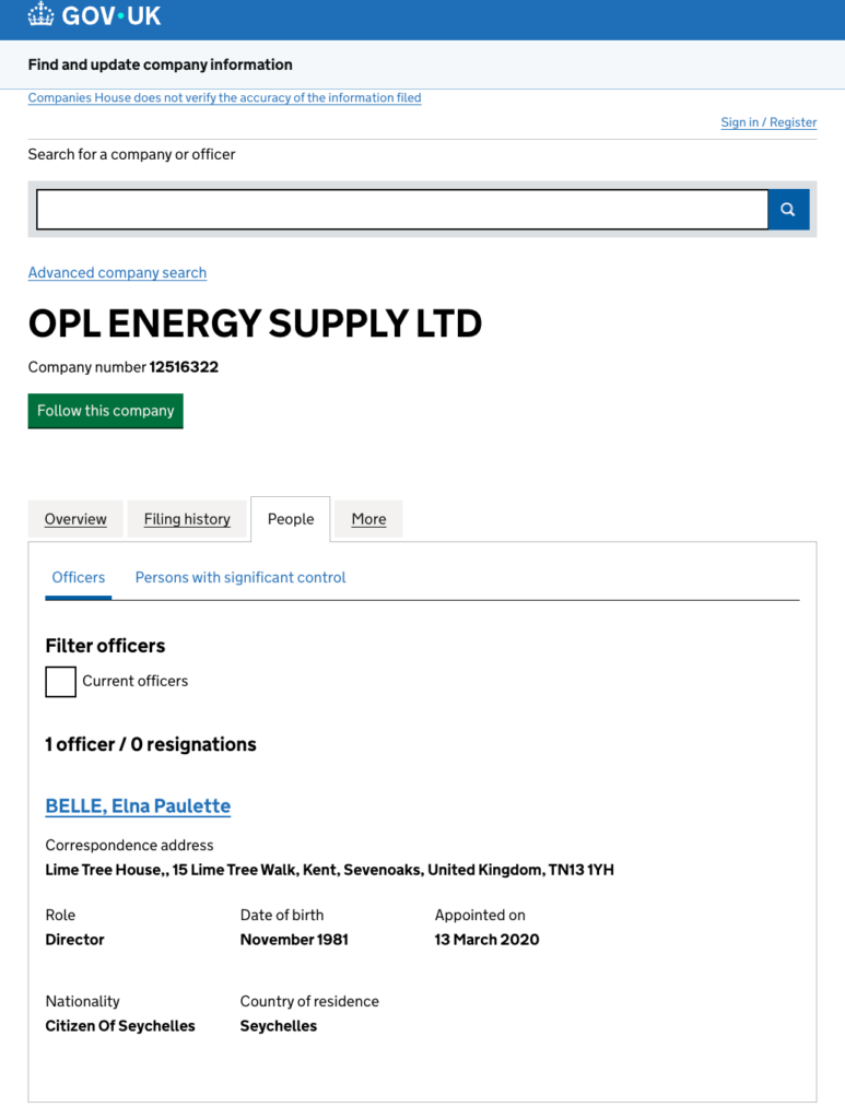 Наприклад, що він має кілька фірм у Великій Британії. Зокрема, можна дізнатися, що однією з його фірм, а саме OPL ENERGY SUPPLY LTD, керує така собі Белле Елна Паулетт.