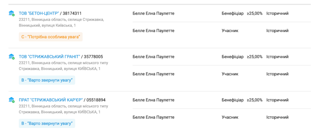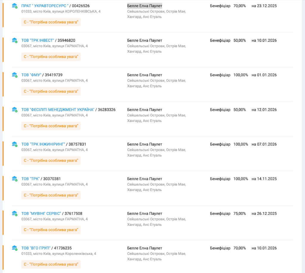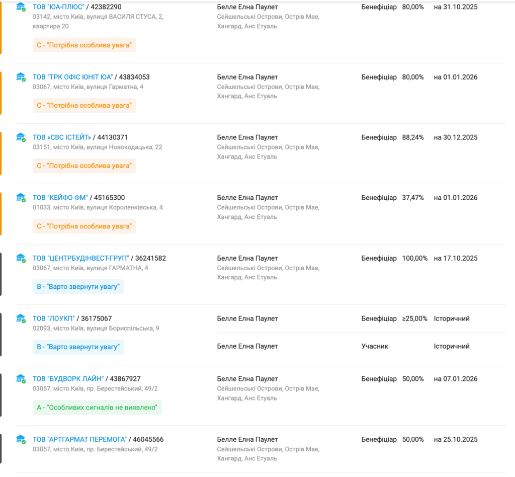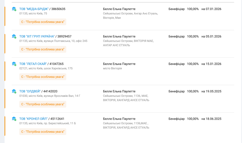 Як Белле Ельна Паулетте вона є бенефіціаркою пʼяти українських компаній.