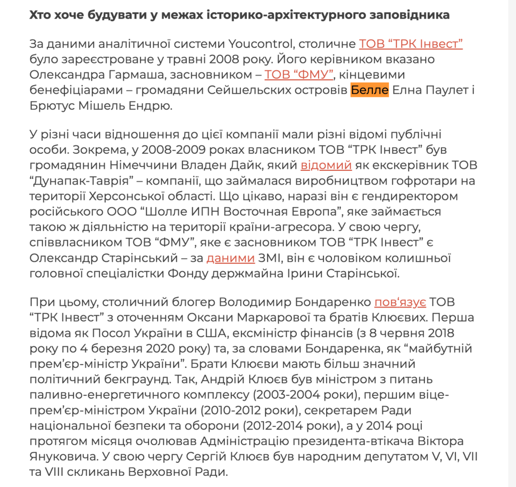 З пані Белле видання повʼязувало фірму, яка планувала вести забудову в історико-архітектурному заповіднику. Вона була кінцевим бенефіціарним власником ТОВ «ТРК Інвест» разом з іншим громадянином Сейшельських островів. Та видання зазначало, що фірму також повʼязують з братами Клюєвими та Оксаною Марковою. Крім того, фірмою до пані Белле володів громадянин Німеччини Владен Дайк, який пізніше став гендиректором ООО в росії.