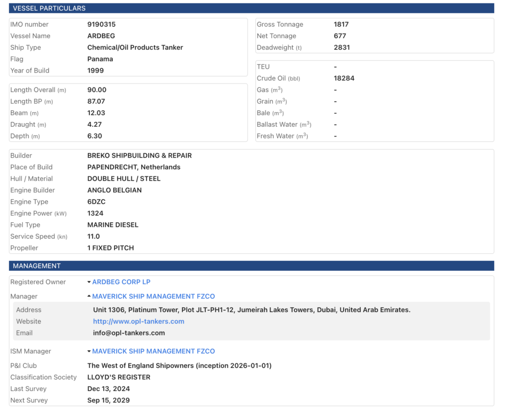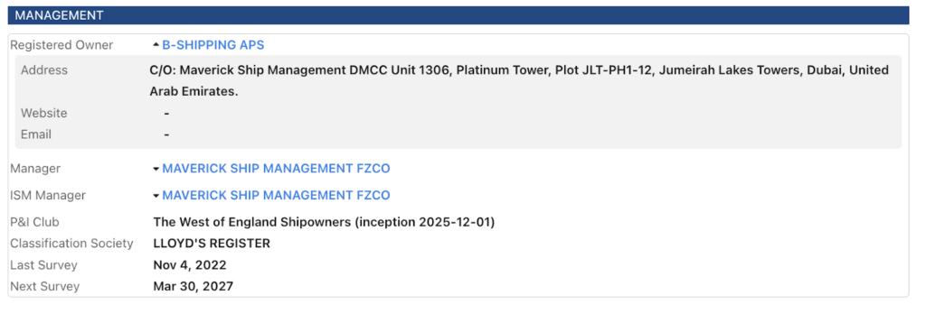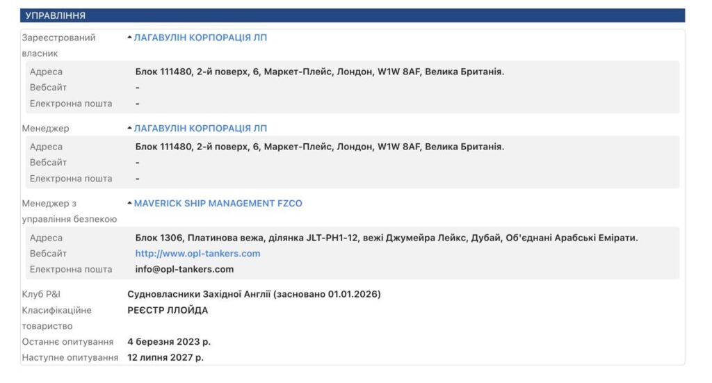 За даними додатка, належить танкер фірмі з Лондона. А керує ним фірма, що має ту саму адресу, що й OPL Tankers DMCC, в тому самому офісі в Дубай. Хоча менеджером вказана MAVERICK SHIP MANAGEMENT FZCO, посилання на її сайт — це посилання на сайт OPL Tankers DMCC. Той, що більше не працює.