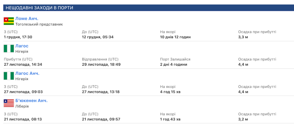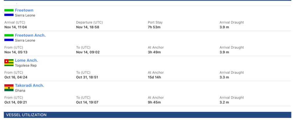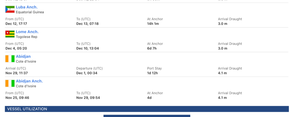 LAGAVULIN за даними додатка Vesselfinder побував в Того в травні 2025 року і це єдиний порт, який він відвідав за рік. У 2021 і 2022 роках за даними додатка Vesselfinder танкер ходив до європейських портів, потім, а потім почав ходити біля берегів Африки. Але за даними magicport в Того заглядав три рази.