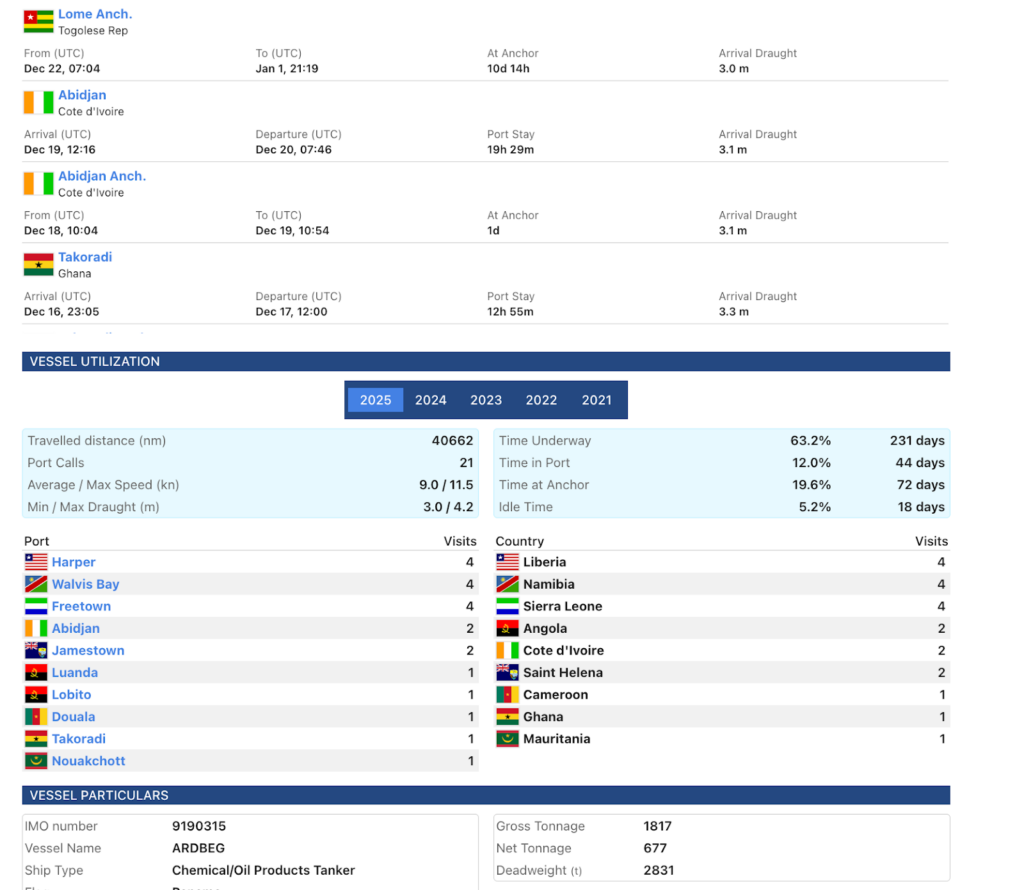 Танкер ARDBEG побував у столиці Того двічі у грудні та раз у жовтні за даними Vesselfinder. Керує танкером також фірма MAVERICK SHIP MANAGEMENT FZCO.