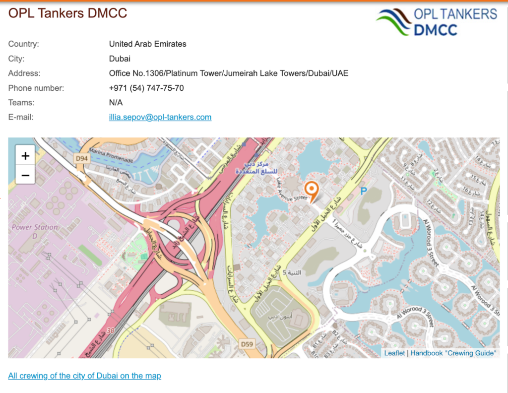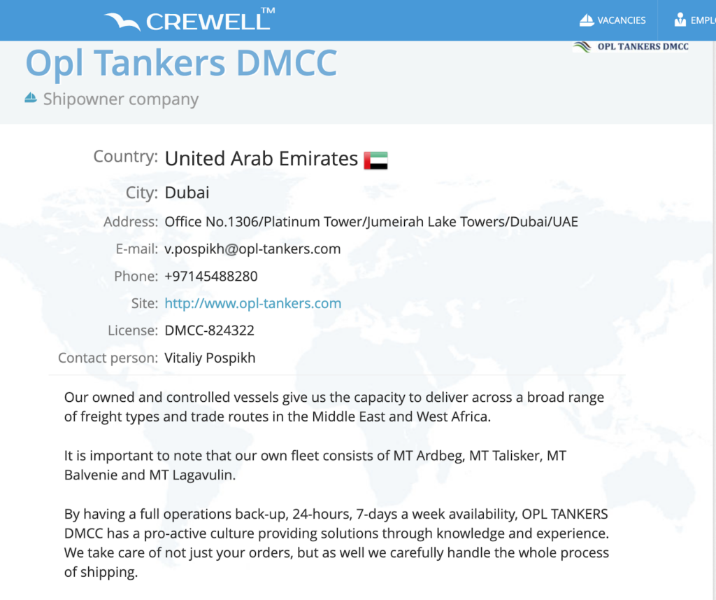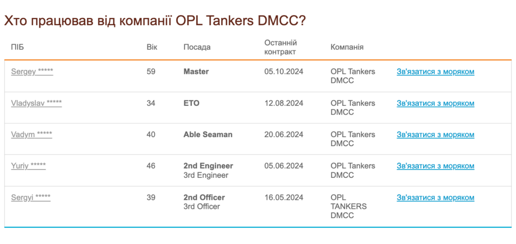 Крюінговий сайт ukrcrewing дає можливість подивитися, хто працював в компанії. Так, в OPL Tankers DMCC працювали моряки з Одеси і Херсона, українець з реєстрацією в Молдові і… мешканець Керчі з російськими документами.