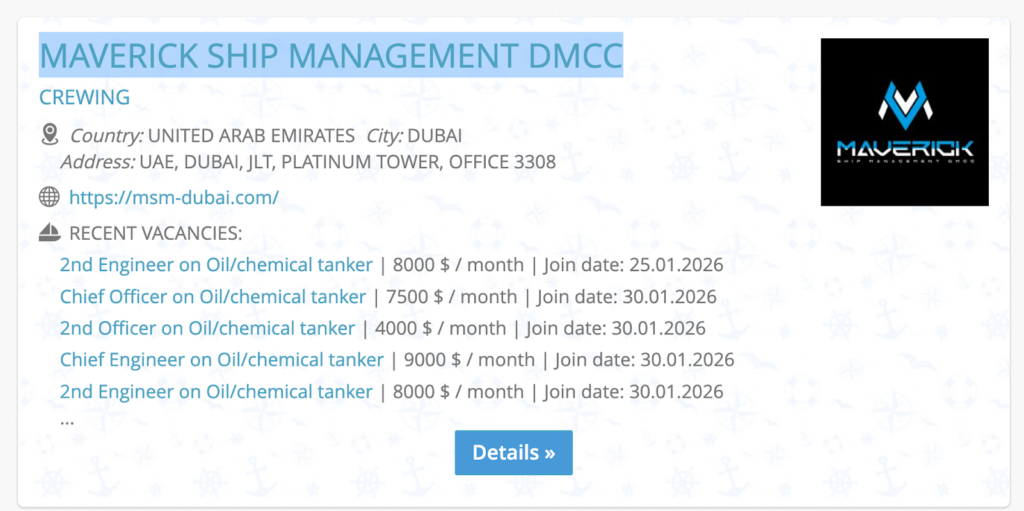 За даними крюінгового сайту crewell.net MAVERICK SHIP MANAGEMENT DMCC саме шукає персонал на танкери.