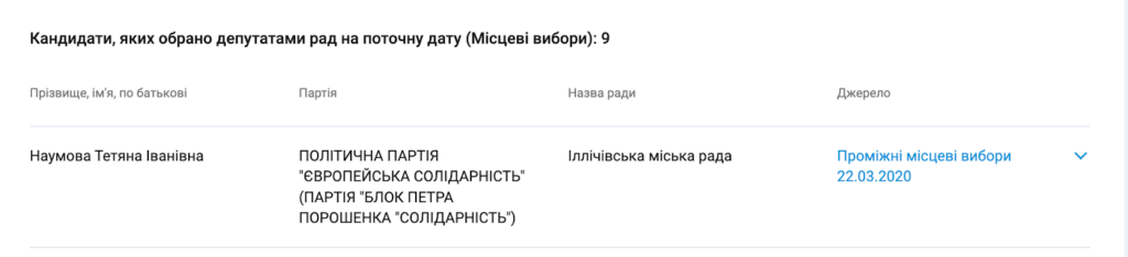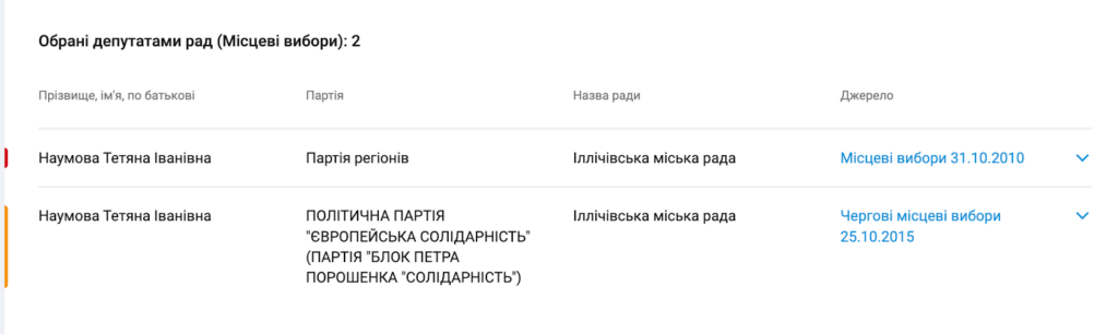 Як депутатка Чорноморської міської ради пані Наумова подає декларації з 2016 року. Тобто зараз в неї вже не перша каденція. За даними аналітичної платформи YouControl, у 2010 році Тетяна Наумова обиралася до Іллічівської міської ради від Партії регіонів. А вже у 2015 nf 2020 році від «Європейської солідарності».