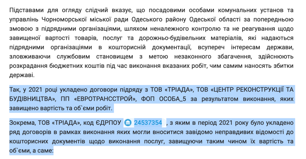 Слідчих зацікавив капітальний ремонт приміщень адміністративної будівлі виконавчого комітету Чорноморської міської ради за 1 364 569 грн та капітальний ремонт актової зали (БТІ №191) будівлі Чорноморської загальноосвітньої школи І-ІІІ ступенів № 7 за 1 770 217 грн. Ці роботи виконувала «Тріада». Суд клопотання слідчих задовольнив.
