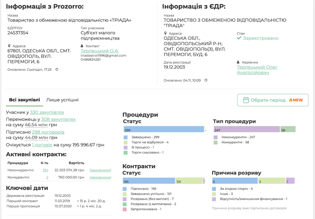 За даними порталу clarity-project, чиновники уклали з фірмою «Тріада» вже 298 договорів на суму понад 44 мільйони гривень.