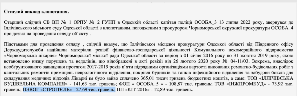 Крім того, фірма згадується в ухвалі по справі 501/1332/20. В ухвалі йдеться про те, що ревізія фінансово-господарської діяльності Комунального некомерційного підприємства «Чорноморська лікарня» з 01 січня 2016 року по 31 жовтня 2019 року встановила низку порушень та недоліків. Зокрема, в ухвалі сказано, що внаслідок необґрунтованого завищення цін протягом 2017-2019 років п`яти підрядними організаціями їм було зайво сплачено 365,01 тисяч гривень бюджетних коштів. Серед цих організацій і «Строітєль».