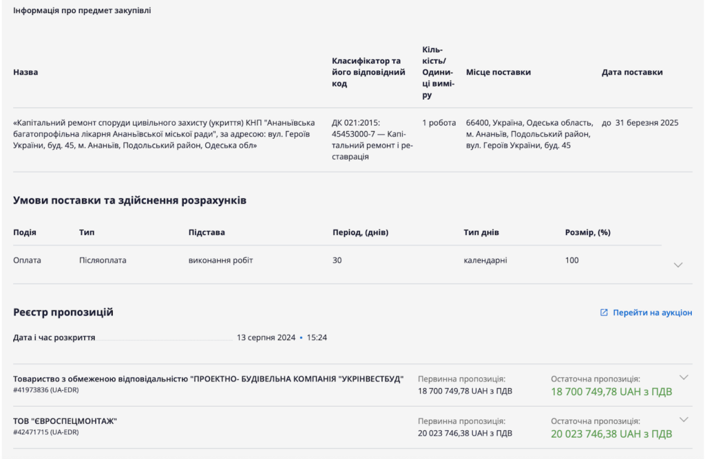 Ремонт укриття Ананьївської багатопрофільної міської лікарні за півтора року вже неодноразово привертав увагу ЗМІ, правоохоронців та органів контролю. Зокрема тому, що адміністрації не з першого разу вдалося провести тендер з обрання підрядника, який виконає роботи. Спочатку планували витратити на ремонт понад 19,9 млн грн. Однак обидві пропозиції учасників медзаклад відхилив.