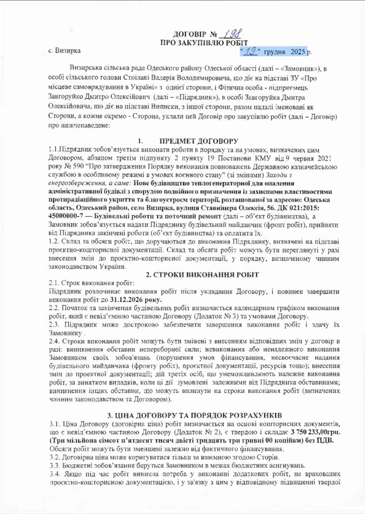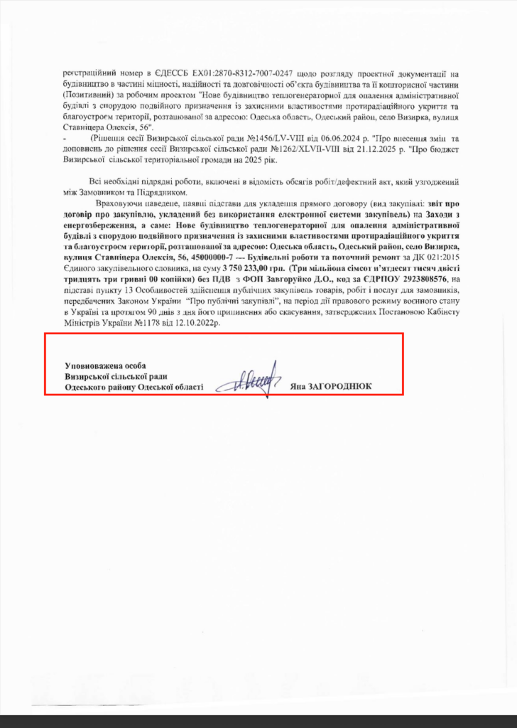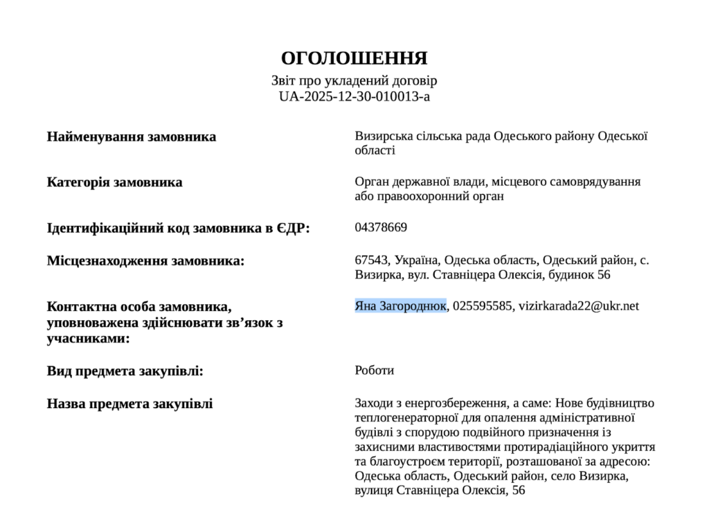 За день до Нового року нашу увагу привернула закупівля робіт з будівництва теплогенераторної для опалення адмінбудівлі та укриття в селі Визирка. Як виявилось, теплогенераторну чиновники замовили для себе. Адже за адресою вул. Ставніцера Олексія, 56, яка вказана у закупівлі знаходиться будівля самої Визирської сільської ради та її протирадіаційне укриття. Вартість робіт оцінили в понад 3,75 мільйона гривень. І, хоча закупівля зʼявилася на порталі лише 30 грудня, договір з підрядником був укладений ще 19 числа.