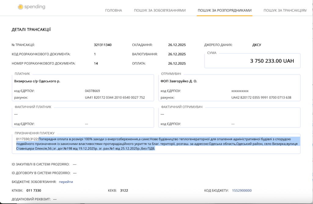 Але цікавішим є те, що вже 26 грудня підряднику перерахували 100% оплати за роботи, які ще навіть не почалися. Про це свідчать деталі транзакції, опублікованої на державному порталі використання публічних коштів Spending. При цьому в ній відсутні згадки про виконання хоча б яких-небудь робіт та наявність актів, підтверджуючих це. Тобто Визирська сільська рада переказала підряднику понад 3,75 млн грн з бюджету громади поклавшись на чесність останнього та згідно з рахунком, який він виставив чиновникам.