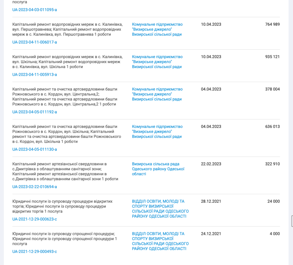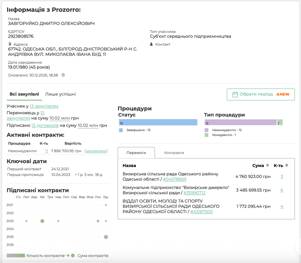 За даними Clarity Project, починаючи з 2021 року з ФОПом Дмитром Завгоруйком було укладено 13 договорів на загальну суму в понад 10 млн грн. І співпрацювали з ним за весь цей час виключно чиновники Визирської сільської ради.