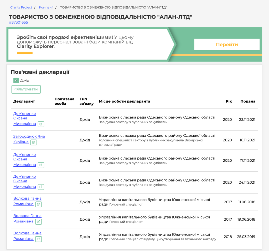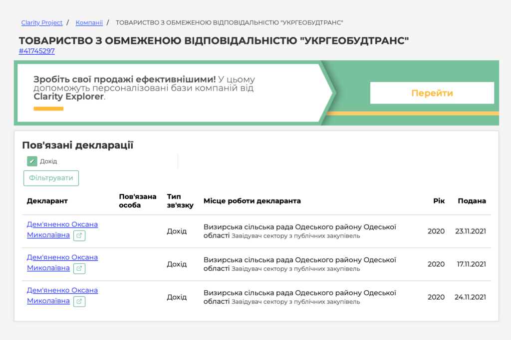 До речі, крім Яни Загороднюк, в ТОВ «Алан-ЛТД» працювала і її начальниця Оксана Демʼяненко. Хоча декларації чиновниці чомусь зникли з реєстру НАЗК, на порталі Clarity Project досі містяться дані про отримання нею доходів від ТОВ «Алан-ЛТД» та ТОВ «Укргеобудтранс». Остання якраз нещодавно отримала новий контракт на додаткові роботи в тому самому протирадіаційному укритті на території Визирської сільської ради. У 2024 році на нього виділили понад 40,1 млн грн, а тепер підряднику без проведення торгів хочуть заплатити ще 18,37 млн з бюджету.