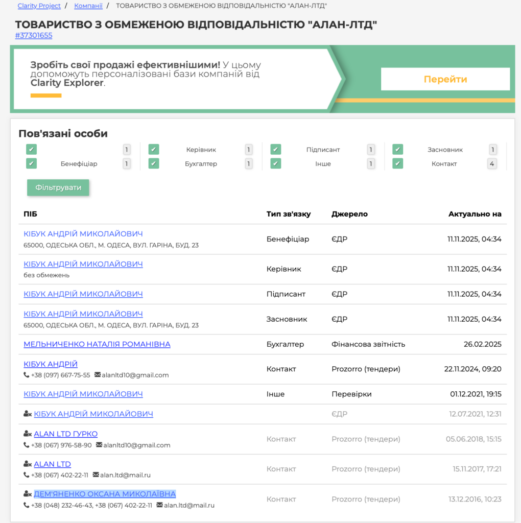 За даними аналітичної платформи YouControl, власником та директором ТОВ «Алан-ЛТД» є одесит Андрій Кібук. Останній, до речі, свого часу надавав в оренду обладнання Дмитру Завгоруйку.