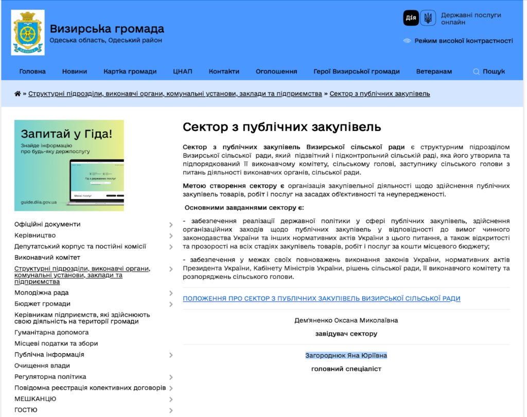 Як виявилося, уповноваженою особою з проведення цієї закупівлі була колишня працівниця підприємця Дмитра Завгоруйка – Яна Загороднюк. Наразі вона є головною спеціалісткою сектору публічних закупівель Визирської сільської ради. І саме вона подала на погодження Визирського сільського голови Обгрунтування підстав для здійснення закупівлі у ФОПа Завгоруйка.