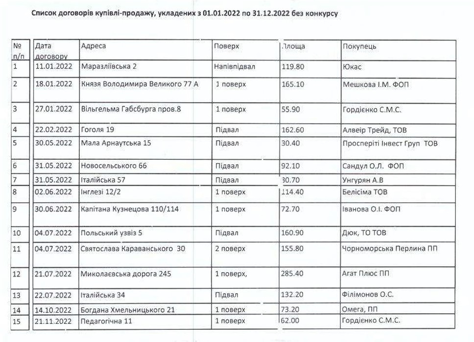 У 2022 році серед приватизованих об’єктів поза конкурсом переважна більшість об’єктів нерухомості зосереджена в центрі Одеси. Сукупно в перший рік повномасштабної війни одеська влада погодила продаж 1713,2 кв. м. нерухомості. Це зокрема напівпідвал площею майже 120 кв. м. на Маразліївській, 2.