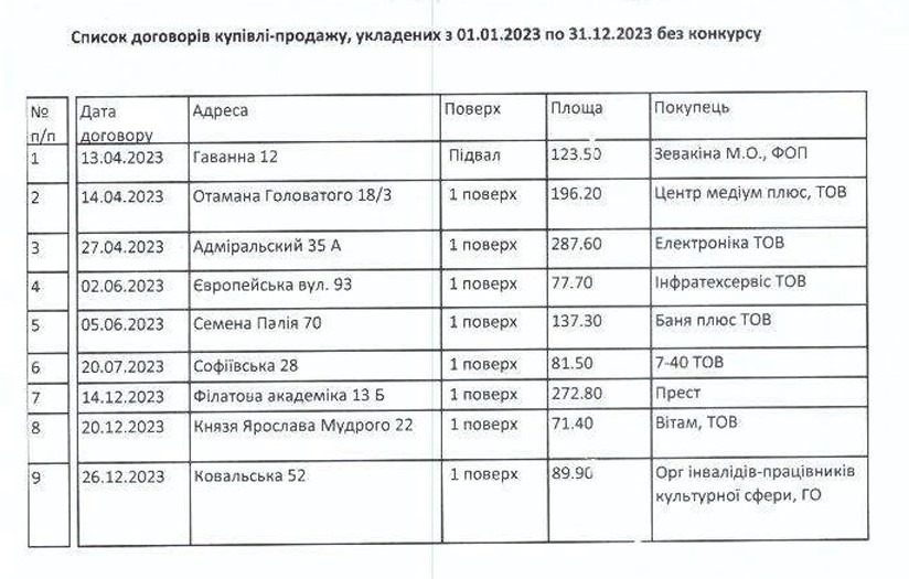 У 2023 році щедрість міських чиновників і депутатів продовжилась – хоча приватизували поза конкурсом тоді лише 9 об’єктів комунальної власності. Але за сукупною кількістю квадратних метрів – це 1337,9, тобто не набагато менше, аніж у 2022-му.