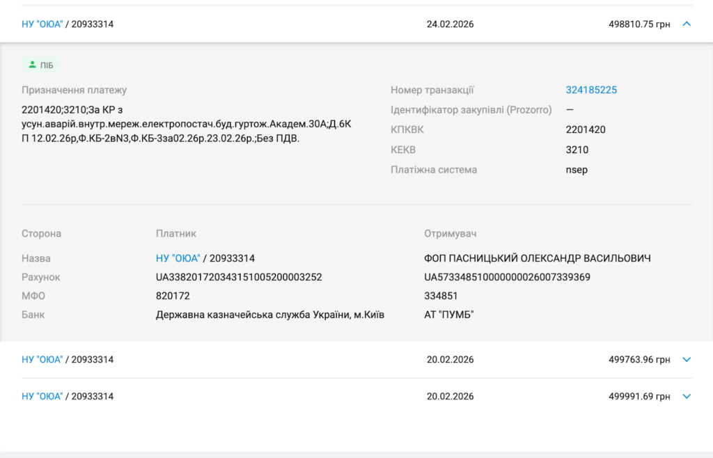 Цікаво, що ФОП вже до 24 лютого повністю отримав оплату за роботу, тобто за 10 днів виконав всі роботи на 1 498 566,40 гривень.