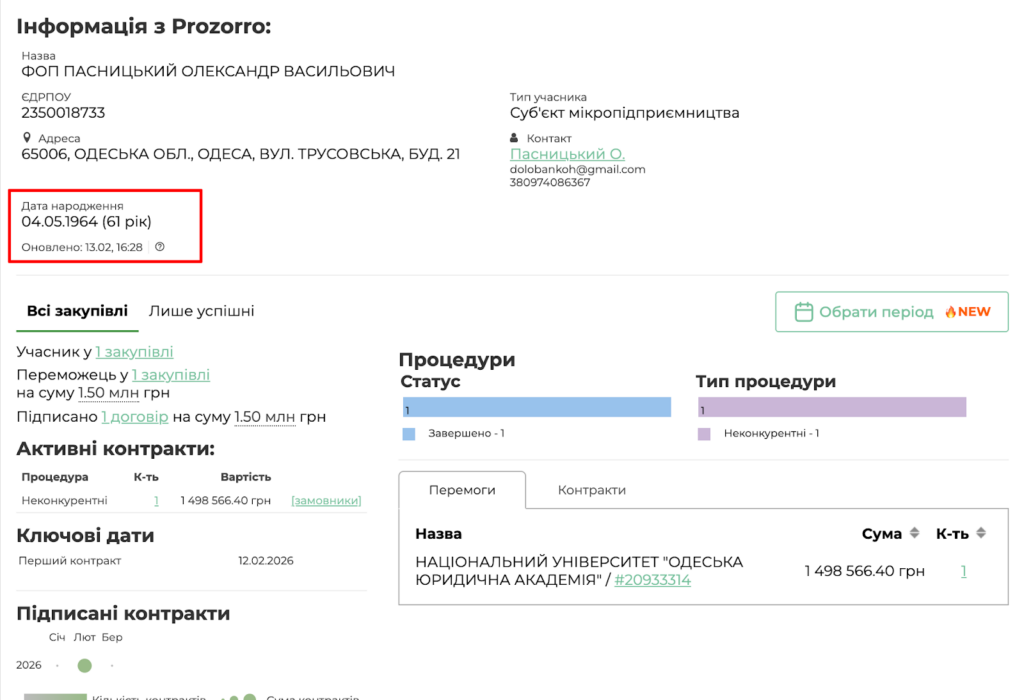 Національний університет «Одеська юридична академія» 3 березня замовив капітальний ремонт з усунення аварій внутрішньої мережі електропостачання будівлі гуртожитку на вул. Л. Толстого, 24. Підрядник, з яким уклали договір без використання електронної системи закупівель існує 14 днів. До цього, 13 лютого Юракадемія найняла для виконання капітального ремонту з усунення аварій внутрішньої мережі електропостачання будівлі гуртожитку по вул. Академічна, 30А виконавця, якому на момент укладання угоди було 4 дні. Цими контрактам любов академії до новонароджених підрядників не обмежується. Ситуація, коли з виконавцями, про яких нічого не відомо, укладають угоди на сотні тисяч гривень цілком типова для даного замовника. Ба більше, по мірі того, як зростає кількість таких виконавців, між ними починають відслідковуватися звʼязки. З начебто незалежних бебі-підрядників складаєтиься цілий «підрядницький дитсадочок».