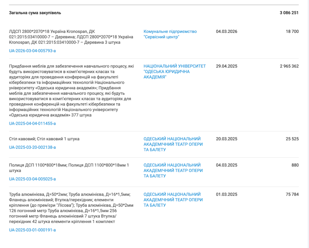 «Національний університет «Одеська юридична академія» 27 квітня завершив закупівлю послуг із хмарного збереження власних даних. Торги, вартістю 2 млн гривень, виграла місцева фірма, що стала єдиним учасником закупівлі… Договір, за результатом відкритих торгів із оболивостями, укладено з товариством «Скайклауд», що належить Ярославу Чехмайстренку та Артуру Хачік’яну. Компанія зареєстрована в Одесі, в її активі 19 угод з розпорядниками публічних коштів на суму майже 9 млн гривень. Левова частини цих коштів, а саме 8,5 млн гривень припадає на угоди саме із Одеською юридичною академією, з якою «Скайклауд» співпрацює з 2019 року».