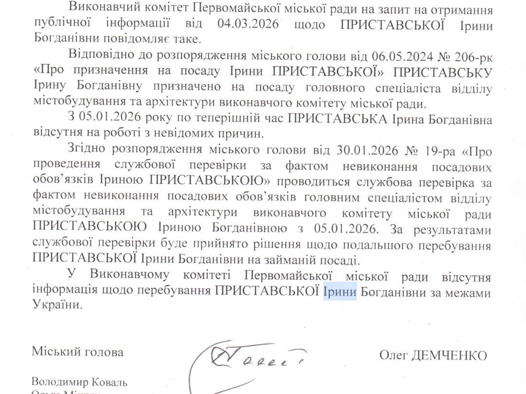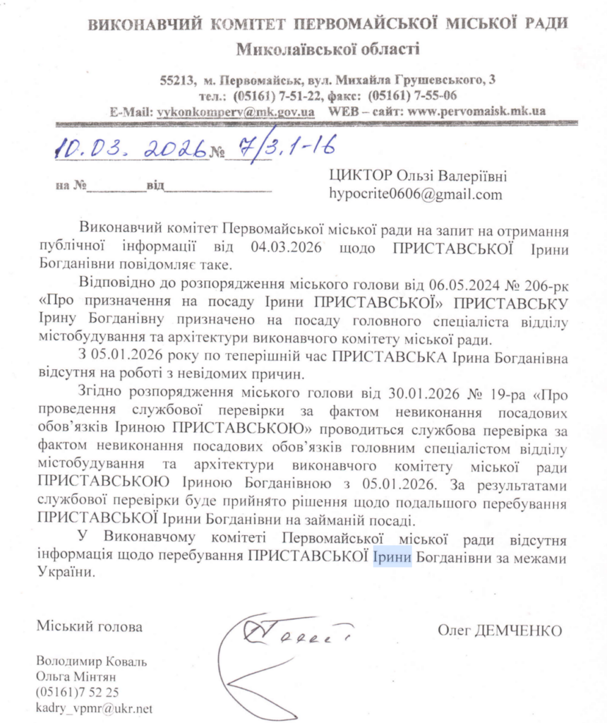 У відповідь на запит «Антикорупційного виміру» Виконавчий комітет Первомайської міської ради Миколаївської області повідомив, що Ірину Приставську призначили на посаду головної спеціалістки відділу містобудування та архітектури у травні 2024 року.