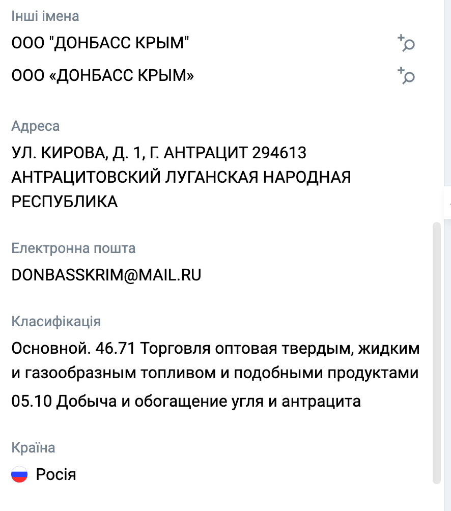 За даними сервісу YouControl World, людина з ПІБ Лебединський Євген Михайлович є власником ООО «Донбасс Крим». Фірма зареєстрована на Луганщині за законами окупантів. Звісно ж, це може бути повний тезка, який випадково теж торгує паливом.