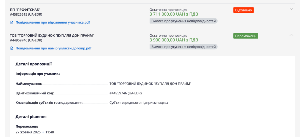 Постачальником вугілля було ТОВ «ТОРГОВИЙ БУДИНОК «ВУГІЛЛЯ ДОН ПРАЙМ». За даними аналітичної платформи YouControl, фірма наразі зареєстрована в Запоріжжі.