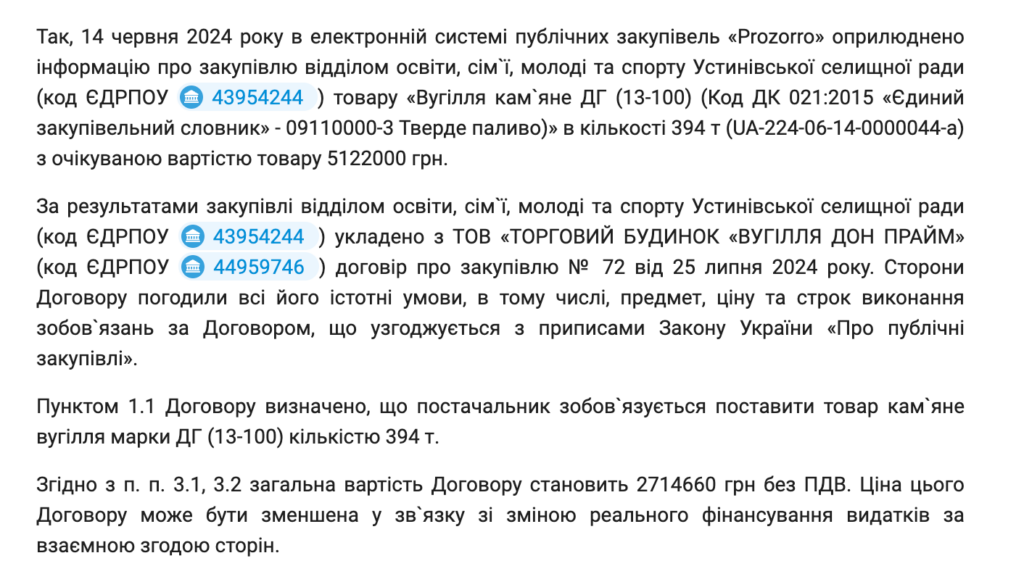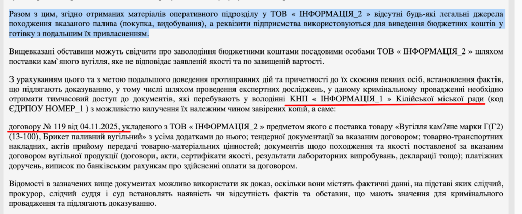 Правоохоронці відкрили справу наприкінці грудня 2025 року, а у лютому звернулися до суду з приводу дозволу на доступ до речей та документів. В ухвалі не згадуються замовник та постачальник вугілля, проте згадується, що мова про КНП Кілійської міської ради, є номер та дата укладання договору. За цими даними можна ідентифікувати закупівлю, про яку йдеться, на Прозорро.