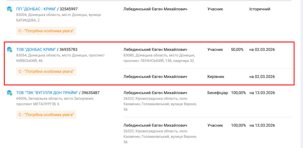 Проте, той Лебединський Євген Михайлович, який раніше володів ТОВ «ТОРГОВИЙ БУДИНОК «ВУГІЛЛЯ ДОН ПРАЙМ», має зареєстровану в Україні фірму з такою самою назвою. «Донбасс Крим».