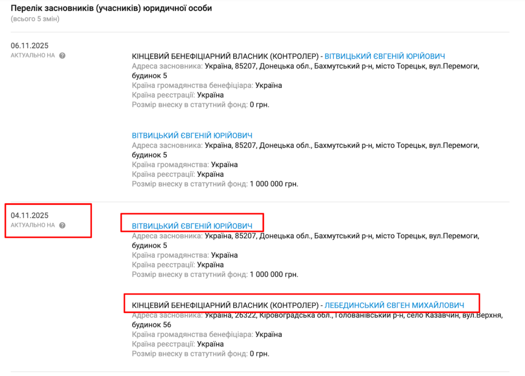 Пан Євген Лебединський, який начебто передав фірму Євгенію Вітвицькому у 2024 році змінював адресу. Він нібито переїхав на Кіровоградщину з Донецька.