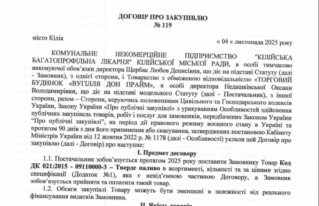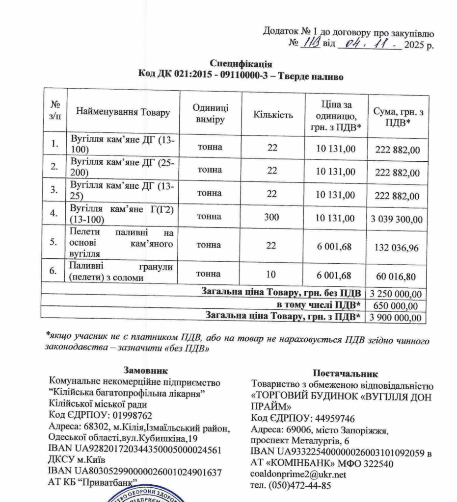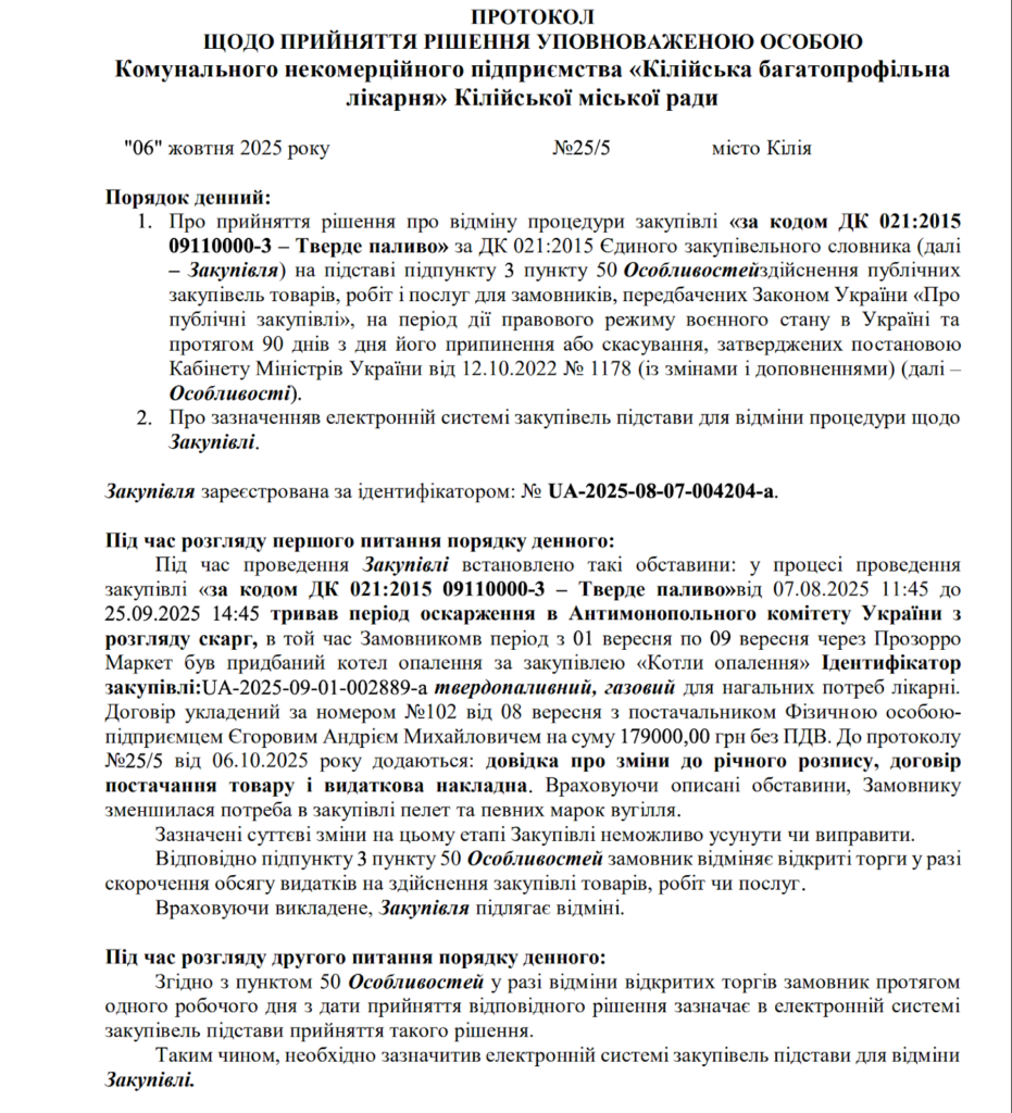 КНП «Кілійська багатопрофільна лікарня» оголосило закупівлю твердого палива на початку серпня 2025 року. Обравши дорожчу пропозицію, посадові особи повідомили про намір укласти договір у разі усунення постачальником невідповідностей.