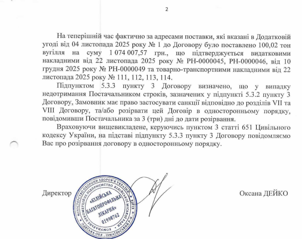 Та у середині грудня 2025 року договір розірвали, оскільки постачальник вчасно вугілля не надав. З близько 300 тонн лікарня отримала лише трохи більше 100.
