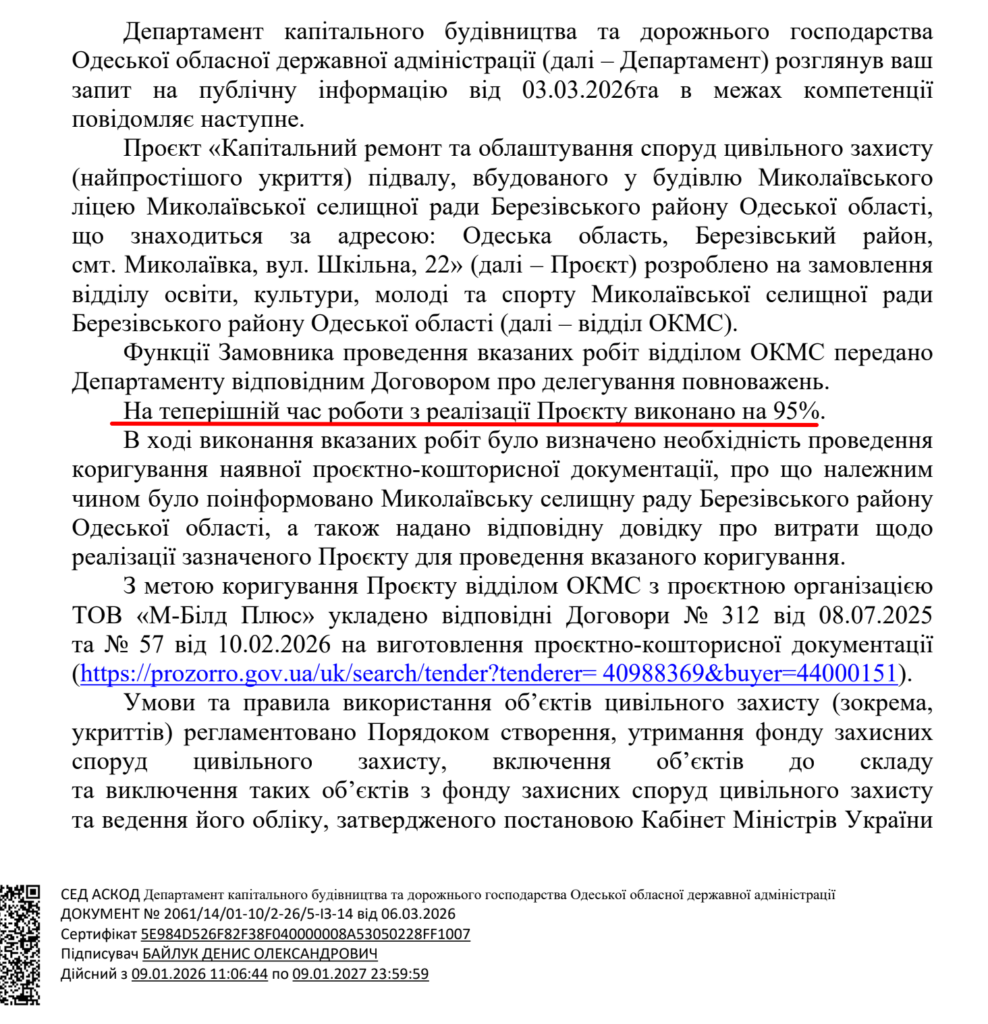 Тож, ще у 2023 році відділ освіти, культури, молоді та спорту Миколаївської селищної ради Березівського району Одеської області з вказаним підрядником уклав угоду на капітальний ремонт та облаштування споруд цивільного захисту (найпростішого укриття) підвалу, вбудованого у будівлю Миколаївського ліцею вартістю 48 тис. грн.