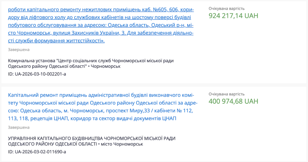 Згодом на Prozorro зʼявився ще один звіт про укладений договір на капітальний ремонт приміщень, який замовила Комунальна установа «Центр соціальних служб Чорноморської міської ради» в будівлі побутового обслуговування на вулиці Захисників України, 3. Там вирішили відремонтувати кабінети №605, 606, коридор від ліфтового холу до службових кабінетів на шостому поверсі. Вартість цих робіт складатиме понад 924 тис. грн, а завершити їх підрядник має в серпні 2026 року.
