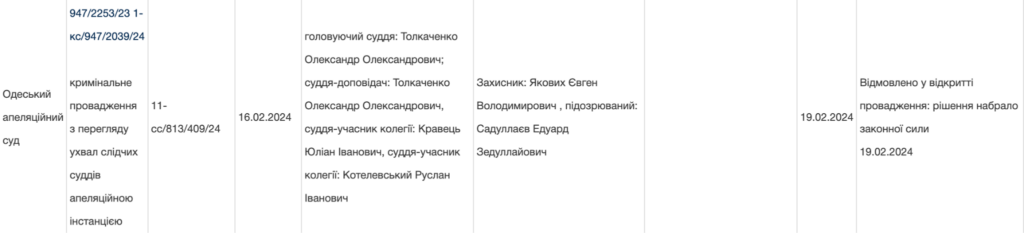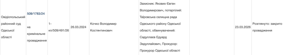 Втім до вироку по суті справа не дійшла. Захист у суді попросив закрити провадження і звільнити Садуллаєва від кримінальної відповідальності через сплив строків давності. У підсумку Овідіопольський районний суд закрив провадження. Збитки Таїровській селищній раді не відшкодували — її цивільний позов залишили без розгляду. Понад 190 тисяч гривень витрат на експертизу теж поклали на рахунок держави.