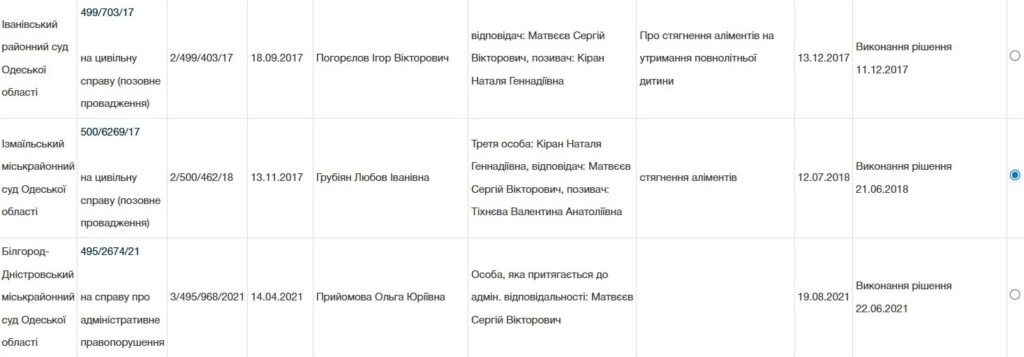 Однак у судовому реєстрі можна знайти декілька справ, в яких фігурантом значиться людина з таким ПІБ – Матвєєв Сергій Вікторович. Зокрема у 2017 році на людину з такими даними подавали до суду щодо стягнення аліментів. Тоді суд встановив, що Сергій Матвєєв має середню заробітну плату з відрахуванням податку з доходів фізичних осіб всього 10 тис. грн.