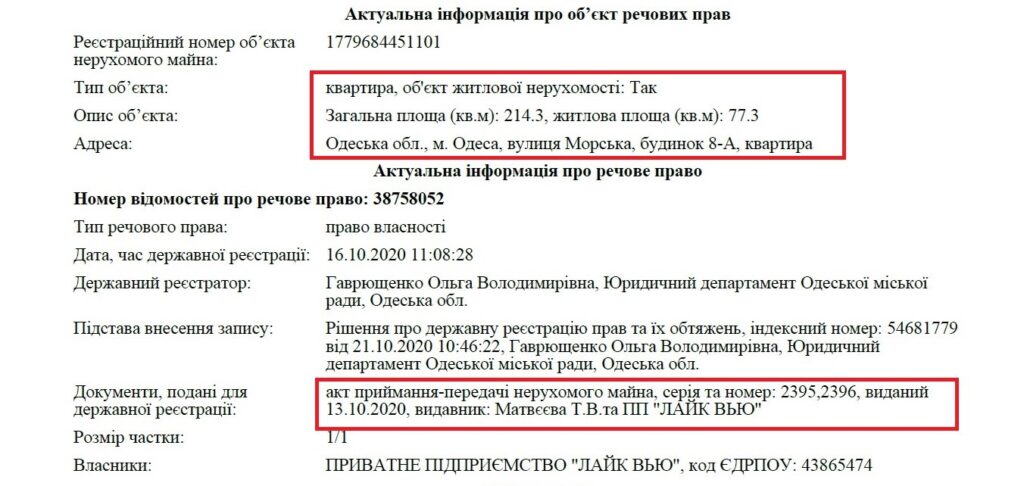 До 2020 року в родині Матвєєвих був ще один цінний актив – квартира в елітному ЖК «Граф» на вулиці Морська, 8а. Квартира площею майже 215 квадратів була записана на ПП «Лайк вью», власницею якого значилась Тетяна Матвєєва.
