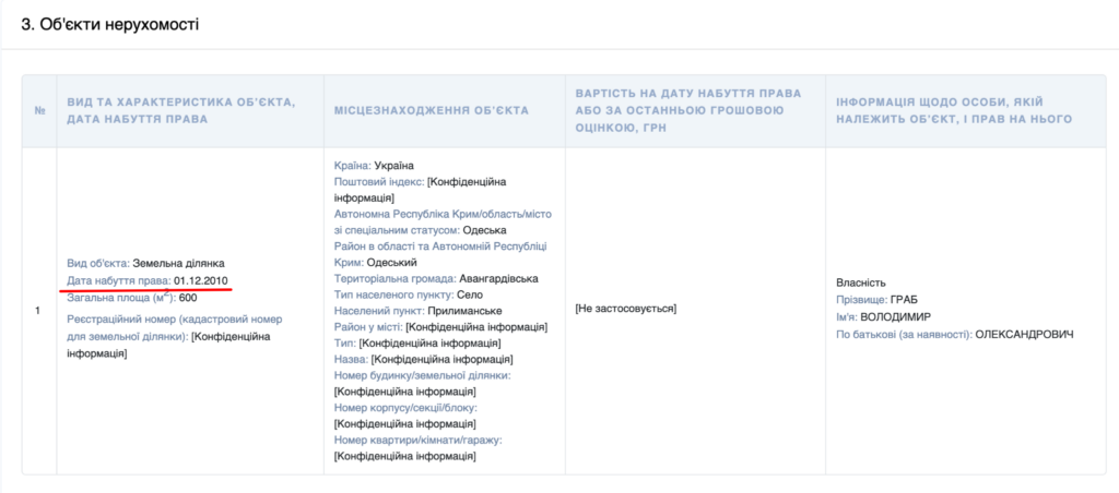 В декларації Володимира Граба за минулий рік зʼявилася земельна ділянка розміром 600 квадратних метрів в селі Прилиманському.