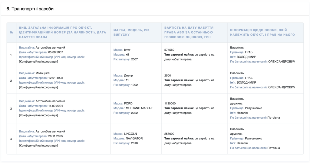 Дружина Володимира Граба, Наталія Ратушненко, придбала дві автівки. Перша машина — FORD MUSTANG MACH-E 2022 року випуску вона купила восени 2024 року за 1,13 мільйона гривень, про що депутат не повідомляв в попередній декларації. І про суттєві зміни майнового стану він теж не повідомляв.