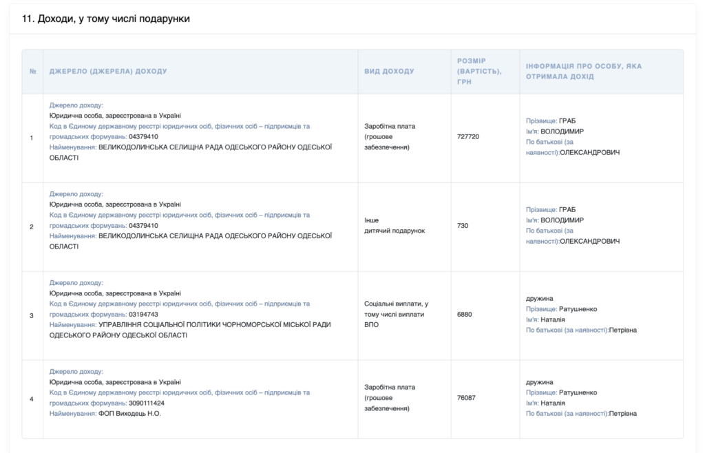 Депутат Одеської районної ради від партії «За Майбутнє», він же начальник управління містобудування, архітектури, архітектурного контролю та житлово-комунального господарства Великодолинскої селищної ради, а в минулому і голова цієї ради, Володимир Граб, подав декларацію за 2025 рік.