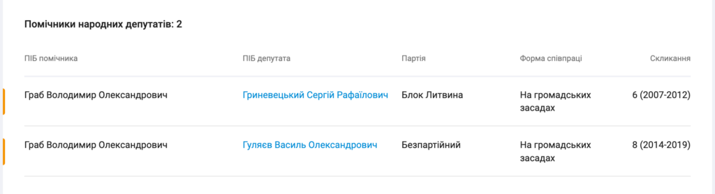 Також раніше Володимир Граб був помічником на громадських засадах у нардепів Сергія Гриневецького і Василя Гуляєва.