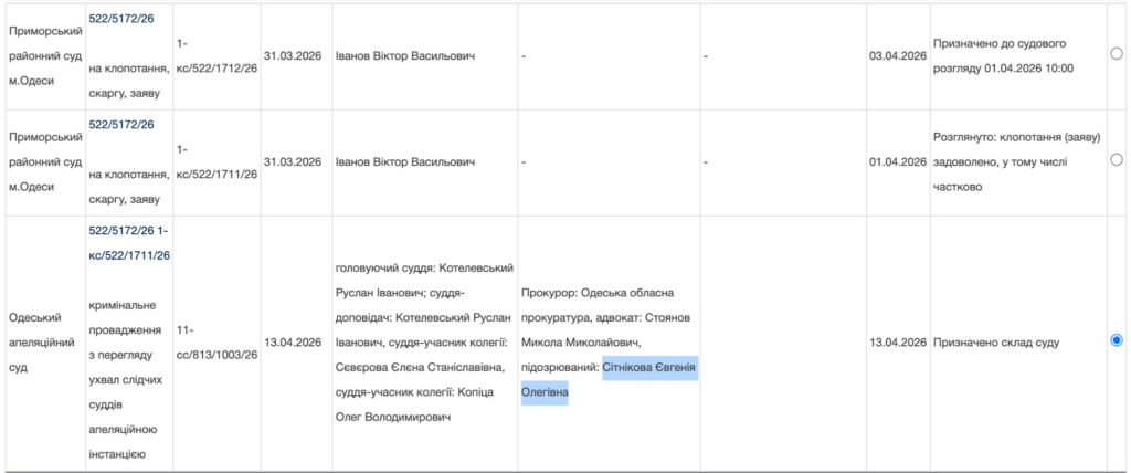 На початку квітня слідчий суддя Приморського районного суду міста Одеси задовольнив клопотання поліції та відправив Євгенію Сітнікову під варту до 25 травня включно. Водночас суд дозволив їй вийти зі слідчого ізолятора, сплативши заставу в розмірі 99 840 грн.