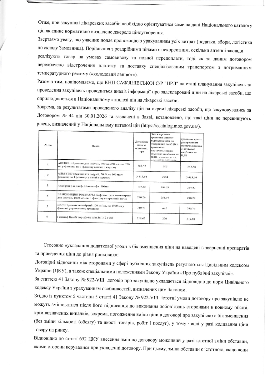 У своїй відповіді лікарня правильно пояснює механізм закупівлі через запит пропозицій постачальників і те, що кваліфікацію учасників здійснює Адміністратор каталогу (ЦЗО), а не сама лікарня. Це дійсно так. І наведена лікарнею таблиця з Національним каталогом цін — теж реальний аргумент.