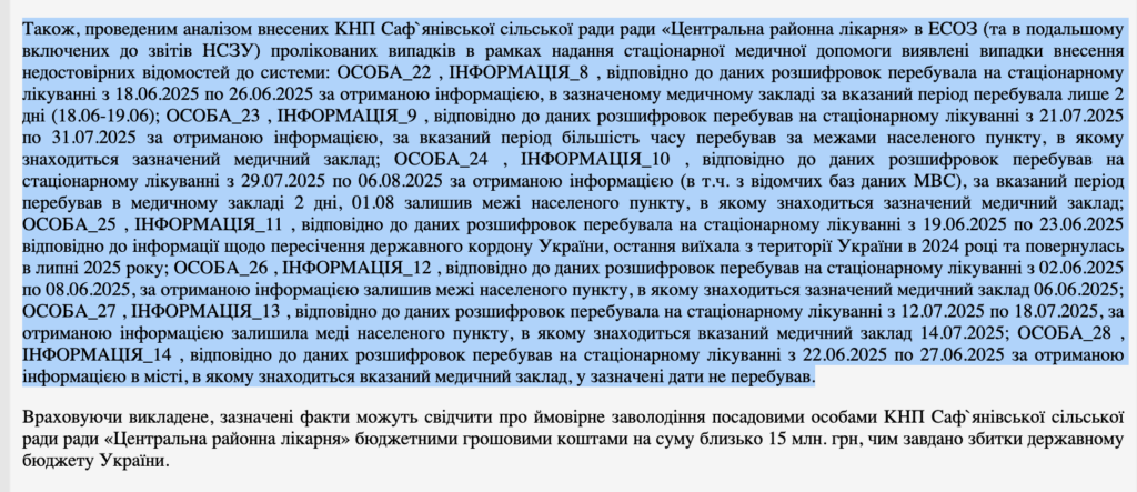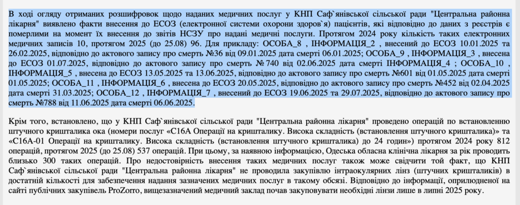 Також слідчі звернули увагу на те, що «Центральна районна лікарня» Сафʼянівської сільської ради подала дані про те, що провела значну кількість операцій по встановленню штучного кришталика ока та операцій на кришталику. Такі операції мають досить високу складність.